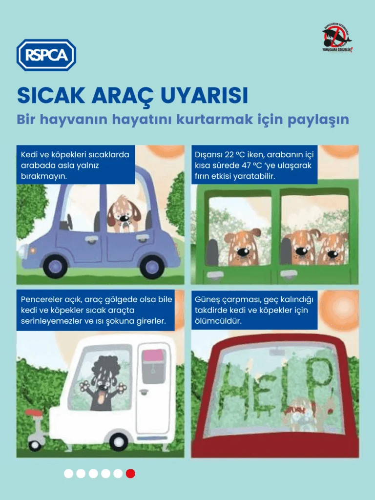 Uzmanlar, hava sıcaklığının 22 derece gibi nispeten ılık olduğu zamanlarda dahi araba içinin dakikalar içinde 38 dereceye yükselebildiğini söylüyor. Özellikle bu sıcak yaz günlerinde ve tatil döneminde, gerekli önlemleri baştan alabilmek ve acil bir durumda hayvanlara yardım edebilmek için, bu önemli hatırlatmayı kedi ve köpeklerle yaşayan tanıdıklarınızla paylaşmanızı tavsiye ediyoruz.
